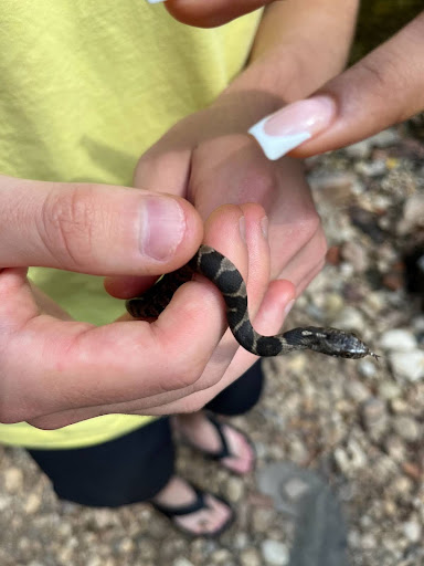 Students gently handle a harmless baby water snake on a field trip. C. Bozarth.